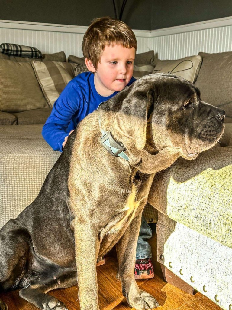 Athena is our laid-back guardian, affectionately known as our ‘four-legged garbage disposal,’ weighing in at a substantial 110 lbs! While she enjoys attention, she’s just as happy to relax and observe the world around her. Playtime is fun, but Athena prefers quiet moments of calmness. She’s naturally cautious with new faces but warms up quickly and always keeps a watchful eye. Athena has a gentle heart and a love for children.
